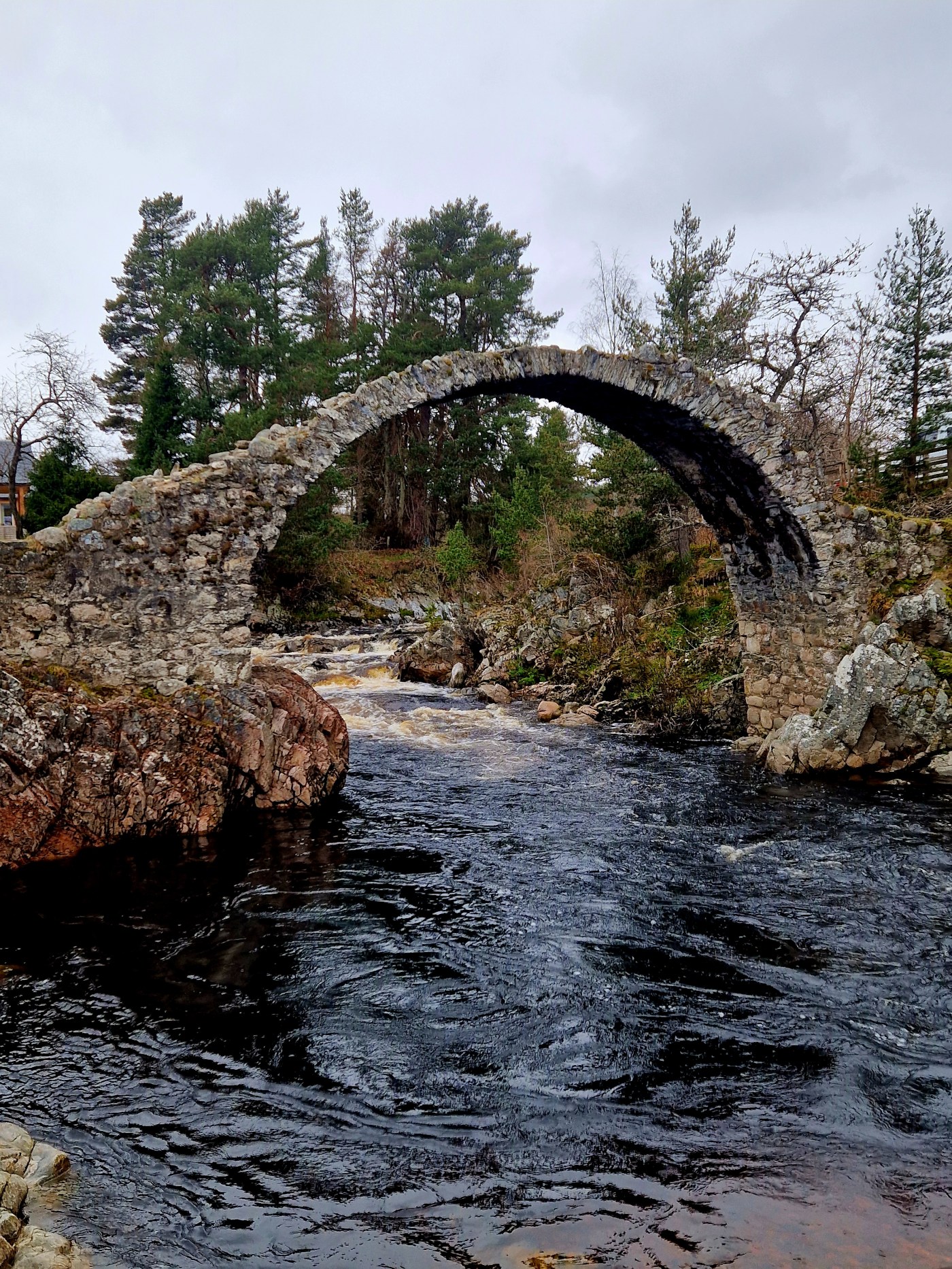 While passing through the Cairngorms we stopped to take a look at this iconic old bridge. Situated in the picturesque Highland village of Carrbridge and also known as ‘Coffin Bridge’, this bridge was built in 1717 to allow funeral processions to reach Duthil Church by crossing the River Dulnain. Notwithstanding, it was a welcome addition to the village, providing a way for tradesmen and locals to traverse the river. It’s a single span humpback arched bridge, now no longer in use and with its side rails missing, all that remains is a slender arch across the river. The viewpoint plaque reads: