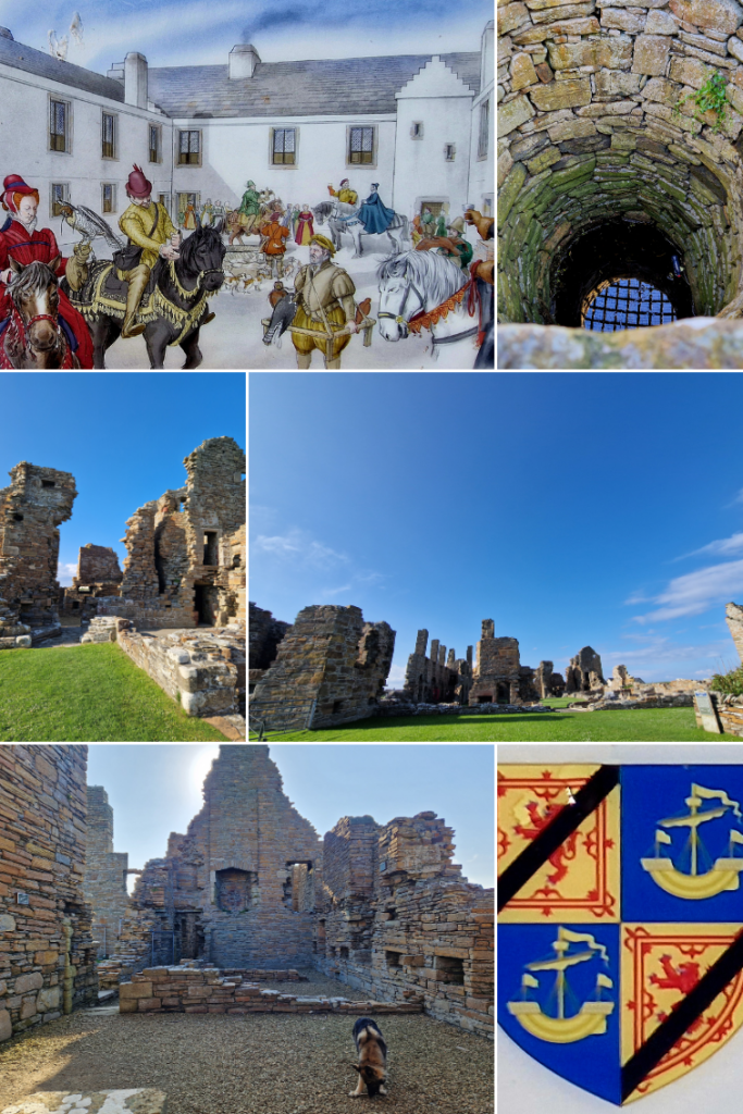The Palace was built in the 1570’s – 1580’s for the notorious Earl Robert Steward, half brother of Mary Queen of Scots. Mary had 13 siblings and Robert was an illegitimate son of King James V and noblewoman Euphimia Elphinstone. After Mary’s forced abdication, Robert remained in the good graces of her son, the young James VI so that in 1581, he was elevated to Earl (Sheriff) of Orkney. Robert considered himself absolute ruler of Orkney and Shetland and this Renaissance style palace was a bold statement of his wealth and power. An inscription in Latin above the palace’s main entrance read – ‘Lord Robert Stewart, son of King James V, King of Scots, commissioned this building’. While Robert clung to his Royal connection, his coat of arms required the Scottish Royal Arms to bear a ribbon through the middle, a symbol of his illegitimacy, while the 2nd and 3rd quarters show the arms of the Earldom of Orkney.