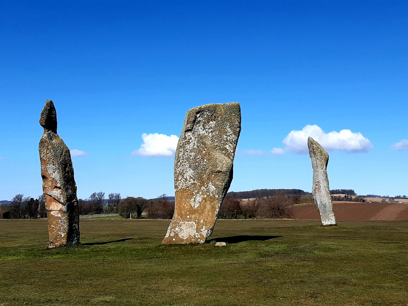 Where once where there were four, now there remains three very impressive, irregularly shaped, red sandstone megaliths. They are thought to have originally been part of the 16M circumference of a complete stone circle from the bronze age, 2000 – 1500BC. It’s said that the missing fourth stone had been broken by treasure hunters, the base remaining with the broken upper lying nearby until 1792. It was then moved by a farmer to allow for better ploughing of the field and was subsequently lost to memory.