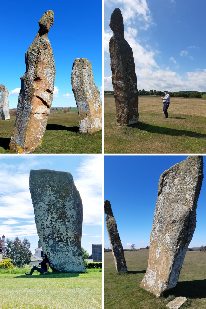 The stone sitting south east, has a height of 4.2M with a slight northward incline. This one is heavily weathered, pitted with a large crack that has developed on its east side. The south stone is 4.6M in height and decidedly inclined southward. Lastly, the north stone is the tallest at 5.1M, having a slight incline westward. Bear in mind that in order for these stones to remain standing they will need be seated into the ground to equivalent lengths