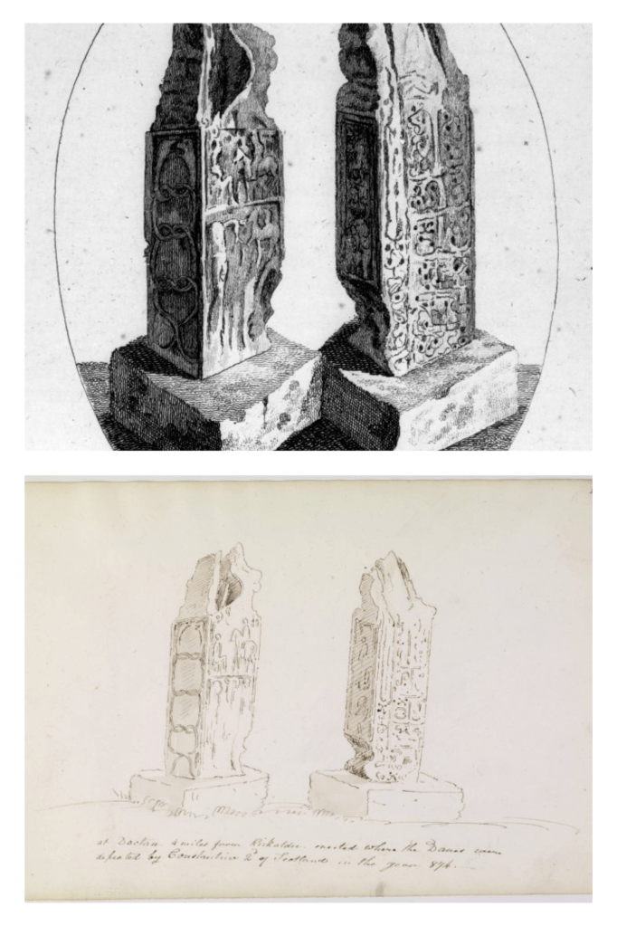 In a wheat field at Dogton Farm, there stands a long forgotten Pictish Stone. Enclosed in iron fencing for protection, it’s a 9th century Class III, free-standing Pictish Cross which seems to have lost its head and arms centuries ago. An etching of the stone was done in 1772 by Thomas Pennant (1726-1798, Welsh naturalist, traveller, writer & antiquarian). Then, another sketch from 1832 by James Skene (1775-1864, Scottish lawyer and amateur artist, best known as a close friend of Sir Walter Scott), mentions that the stone was “at Dogton, 4 miles from Kirkcaldy, erected where the Danes were defeated by Constantine 2 of Scotland in the year 874”. Both illustrate the Dogton stone in its damaged condition.