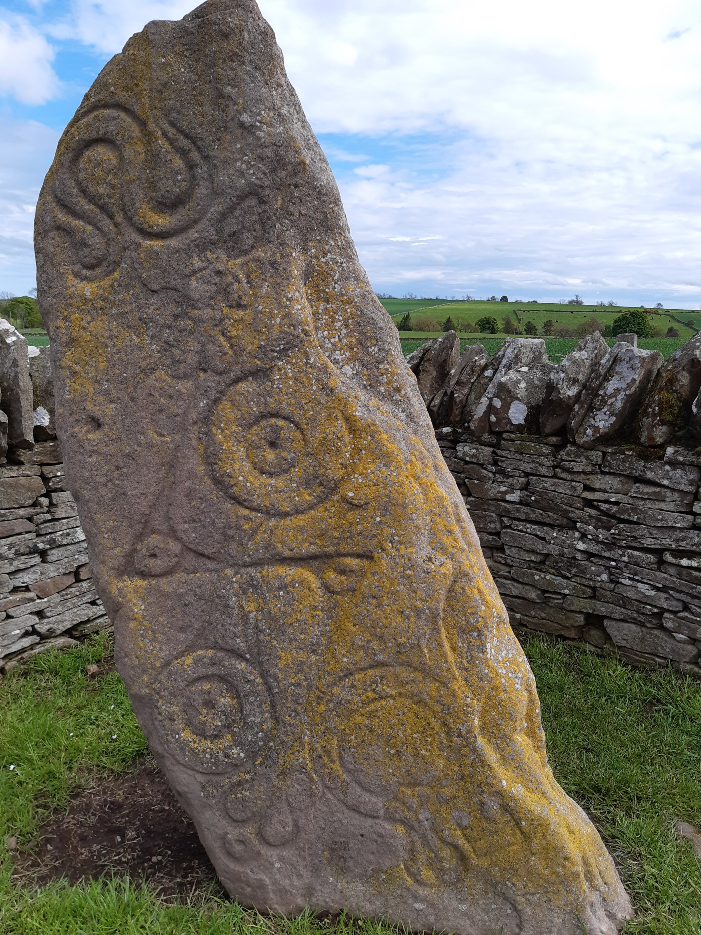 I was excited to come here on this wet and incredibly windy day to encounter a trio of remarkable remnants from our ancient past. AND what a way to begin my journey into Scotland’s pre-history! The Picts ruled much of Scotland during the Dark Ages, had a strong and distinct culture yet little is known of these warring and artistic people. Along the roadside in the village of Aberlermno are three magnificent Pictish stones bearing symbols from three graphic styles as their society evolved from Pagan to Christian worship.