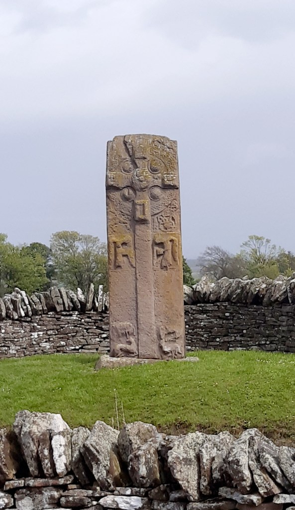 The front of this stone has been deciphered as follows: Within a massive wheelhead cross there are Five circular bosses on the cross – possibly representing the wounds of Christ. Mourning Angels – holding gospel books.