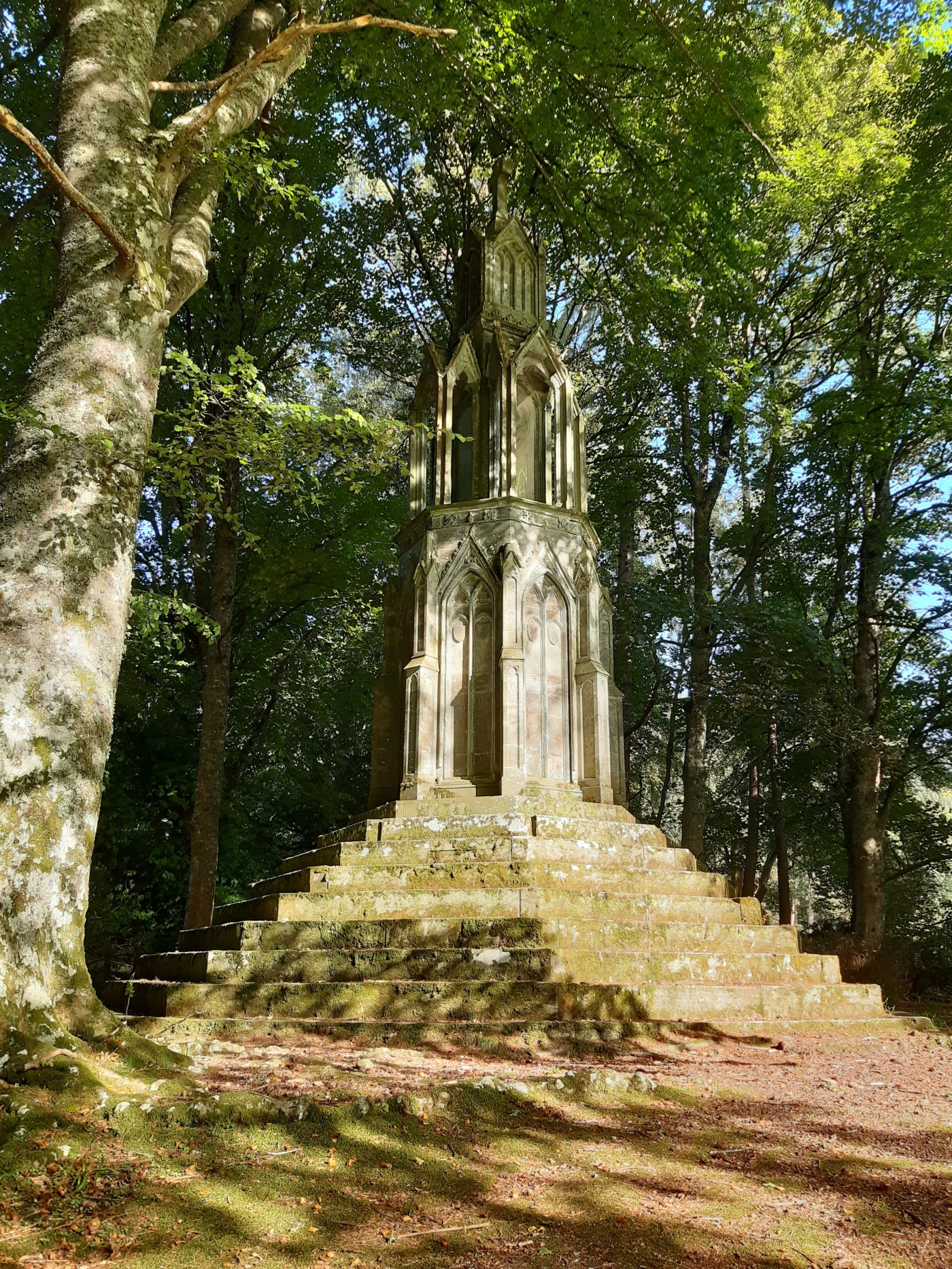 I’d brought my Children camping to Kenmore over the years so it evoked happy memories to be visiting again. There are lovely walks around this area and so Millie and I set off on a jaunt through the woods to take in the Eleanor Cross and onward towards Aberfeldy. The pathway starts by the bridge at the mouth of the Loch and meanders along the north side of the river for a while then heads up the hill through the woods. The Cross was commissioned in 1831 by Lord Breadalbane in tribute to his beloved wife Mary. At that time it would have had a view of the hills and down along the valley with beautiful vistas of the River & Loch Tay. In all these many years however the woodland has grown up high into beautiful mature trees with birdsong echoing through them.