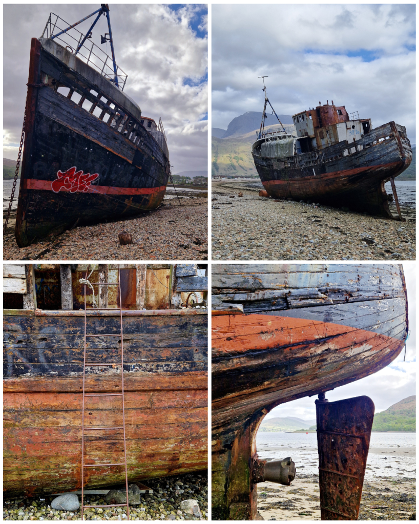 Abandoned on the stony beach between Caol and Corpach where Loch Linnhe meets Loch Eil, rests the ‘MV Dayspring’. Nicknamed ‘Golden Harvest’ she worked out of Kilheel in Northern Ireland as a trawler boat, fishing herring & mackerel until 2001. She was retired to Kinlochleven Pier in 2009 with plans to transform her into a floating restaurant. During a violent storm in 2011, Golden Harvest broke free from yet new moorings at Camusnagaul Bay, when the coast guard was required to rescue then guide her to her pebbly repose in the shadow Ben Nevis. She remains there, a photogenic and beloved celebrity.