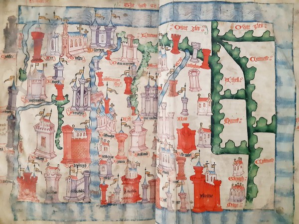Hardyng had originally been sent as a spy on a secret mission to Scotland by Henry V (1413-1422) who intended to invade. However, Henry V died so the map became part of Hardyngs first chronicle, ‘A History of England and its Neighbours’. Hardyng suggested a route England’s army could take to invade Scotland.