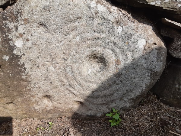 This isn’t actually an ‘earth house’ but an Iron-Age souterrain, a subterranean passage that was originally roofed over with stone slabs. A small room at the end of the chamber here had been created by a pair of huge, up-right slabs. It was discovered in 1871 while a local farmer was ploughing the field here. Souterrains can be found around Scotland’s eastern coast and built around 2,500 years ago, they would have been part of farming settlements made up of clusters of timber roundhouses. Souterrains seem to have been accessed from within a roundhouse built above, providing a cool dark place, most probably used for storing food. They would, however, have been vulnerable to dampness and vermin. They could also have been used as places of refuge if the settlement was under attack. As you can see from the stone-walling, this was skilfully built and may have incorporated a symbolic function. Here at Tealing, pre-historic rock art is carved into one of the huge stones by its entrance. The cup and ring marked stone perhaps represents the sun, the portal to a spirit world, even life itself, or life beyond this realm – eternity.